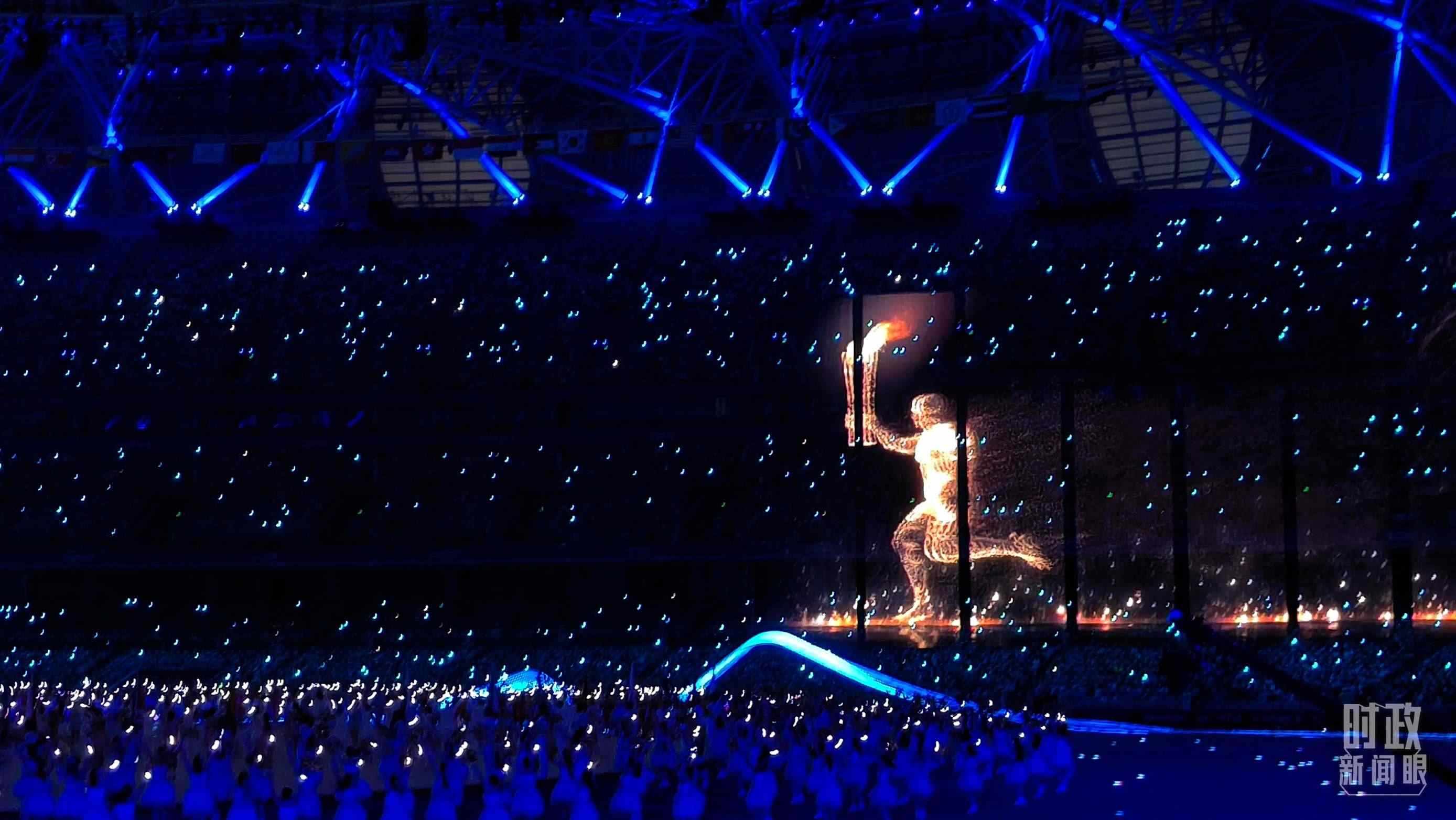 △“數(shù)字火炬手”入場,與現(xiàn)場火炬手共同點(diǎn)燃主火炬。(總臺(tái)央視記者王子杭、總臺(tái)國廣記者李晉拍攝)