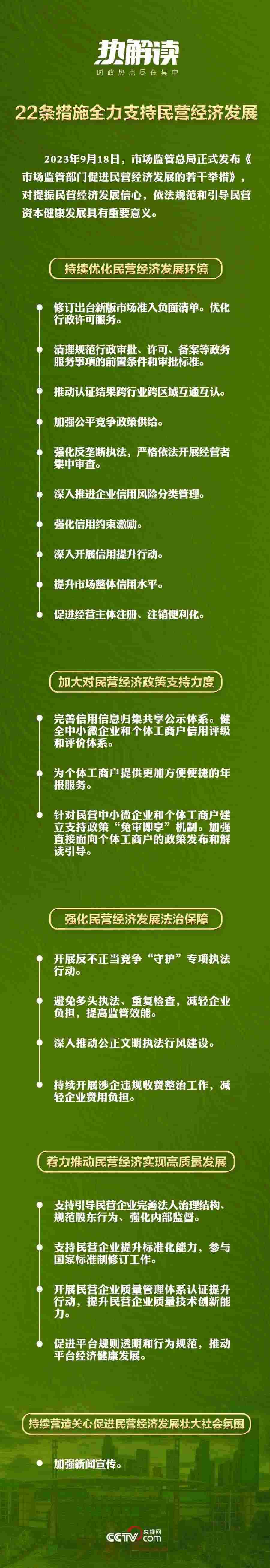2023年7月14日,中共中央國務(wù)院出臺《關(guān)于促進(jìn)民營經(jīng)濟(jì)發(fā)展壯大的意見》,對促進(jìn)民營經(jīng)濟(jì)發(fā)展壯大作出新的重大部署。2023年9月18日,市場監(jiān)管總局發(fā)布《市場監(jiān)管部門促進(jìn)民營經(jīng)濟(jì)發(fā)展的若干舉措》,通過22條措施為全力支持民營經(jīng)濟(jì)發(fā)展設(shè)計了具體落實的“施工圖”。