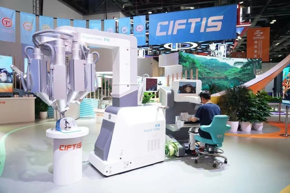 △2023年服貿(mào)會(huì)國家會(huì)議中心綜合展區(qū)展出的單孔腔鏡手術(shù)機(jī)器人