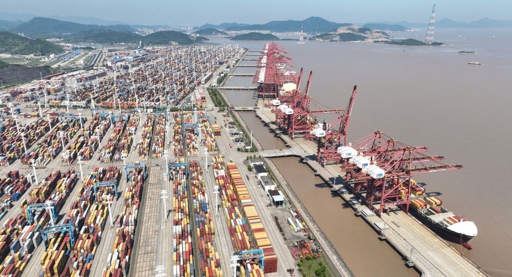 貨輪停靠在寧波舟山港穿山港區(qū)裝卸貨物(2023年5月9日攝,無人機(jī)照片)。新華社記者 翁忻旸 攝