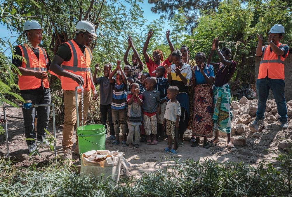6月13日,在坦桑尼亞姆萬扎省米松圭,凱爾文(左二)與同事接通水管后贏得當?shù)鼐用窆恼茪g呼。新華社記者 王冠森 攝