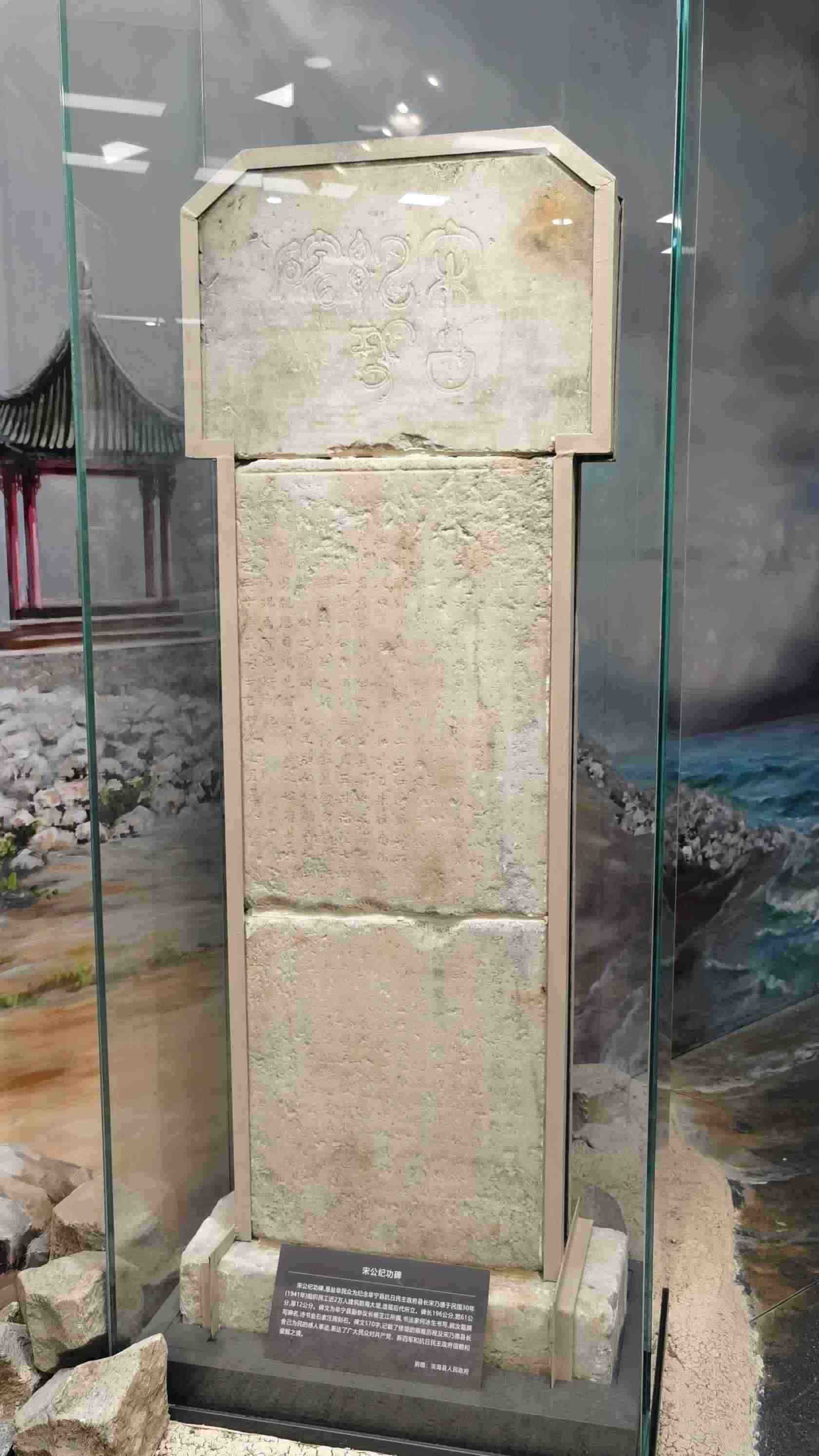 △新四軍紀(jì)念館里的宋公紀(jì)功碑。此碑是鹽阜民眾為紀(jì)念阜寧縣抗日民主政府縣長宋乃德于1941年組織修筑海防大堤所立。碑文記載了修筑大堤的艱難歷程,表達(dá)了鹽阜民眾對(duì)共產(chǎn)黨、新四軍和抗日民主政府的信賴和愛戴之情。(總臺(tái)央視記者郭鴻拍攝)