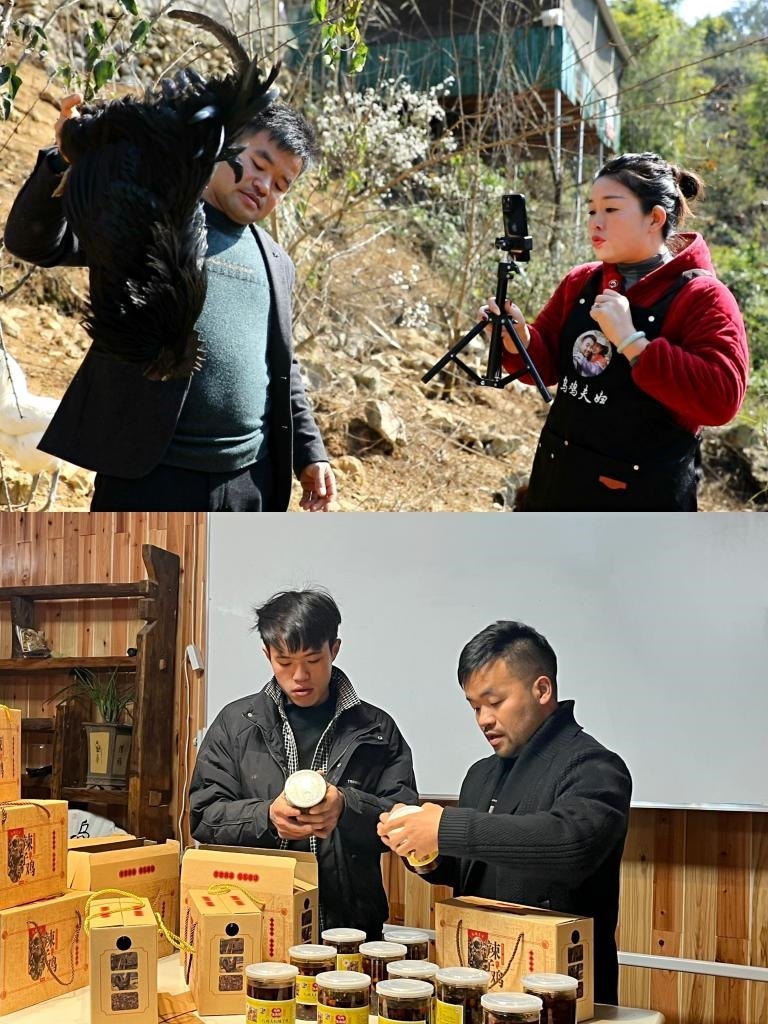 上圖:2月2日,袁彬(左)在烏骨雞莊園進行直播。(陸志秋 攝)下圖:2月6日,袁彬(右)在查看烏骨雞產品。(袁思云 攝)