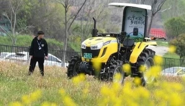 ▲位于光谷北斗大廈的武漢依迅北斗時空技術(shù)股份有限公司園區(qū)內(nèi),安裝了北斗高精度農(nóng)機自動駕駛終端的拖拉機正在進行測試