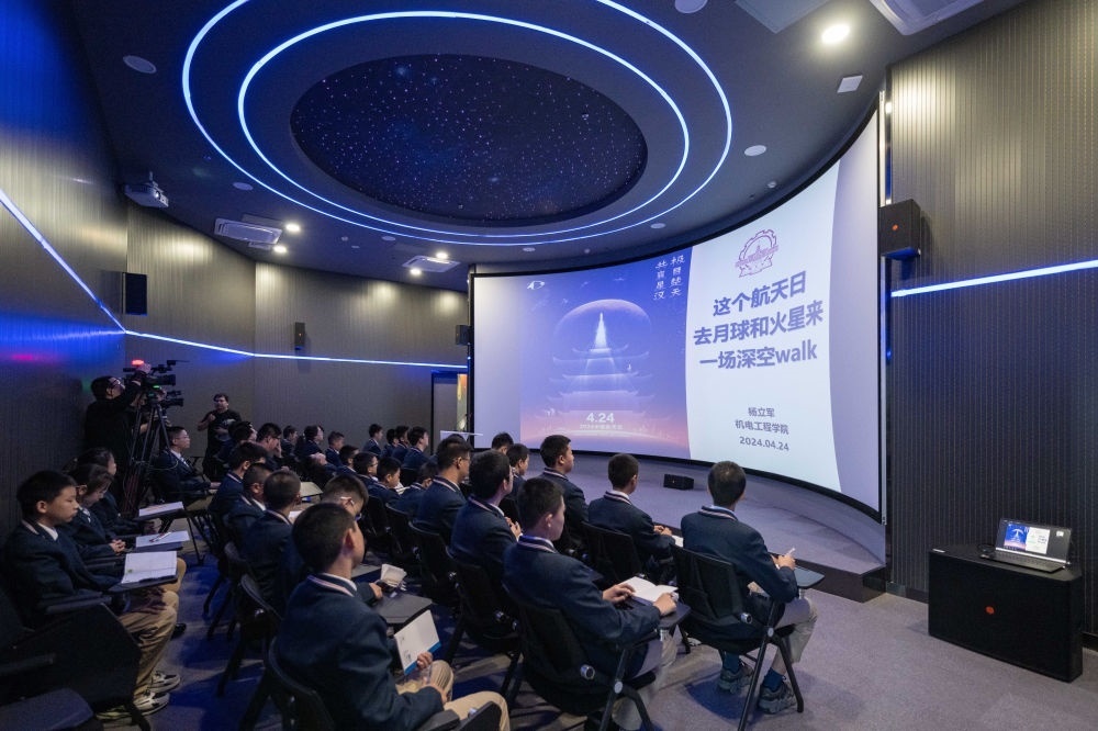 學(xué)生在哈爾濱工業(yè)大學(xué)航天館內(nèi)聽中國航天日主題講座(2024年4月24日攝)。新華社記者 謝劍飛 攝