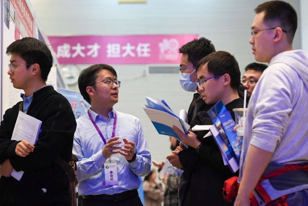 在清華大學(xué)舉辦的2024屆畢業(yè)生大型就業(yè)洽談會上,一名用人單位招聘人員(左二)與求職畢業(yè)生交流(2024年3月15日攝)。新華社記者 鞠煥宗 攝