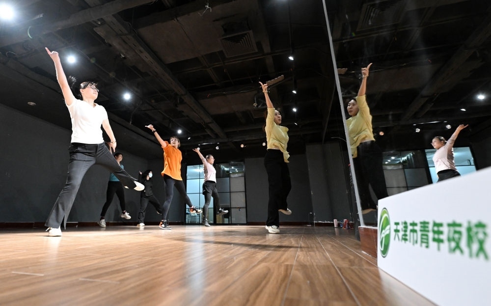 在天津青年宮,學(xué)員在青年夜校練習(xí)有氧健身舞(2024年4月23日攝)。新華社記者 趙子碩 攝