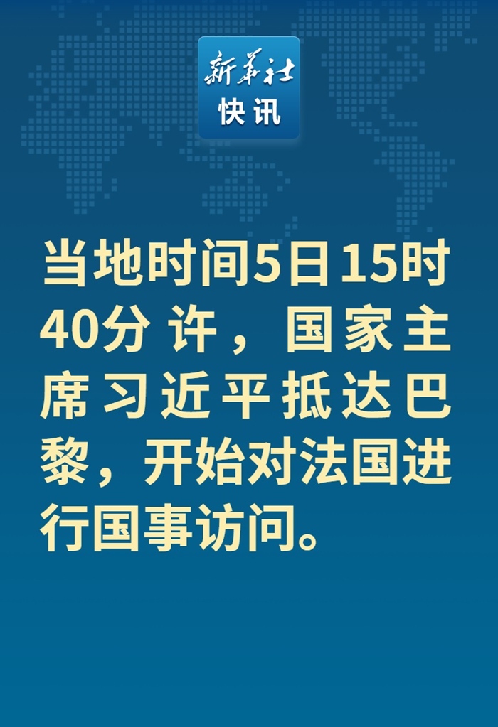新華社快訊:當?shù)貢r間5日15時40分許,國家主席習(xí)近平抵達巴黎,開始對法國進行國事訪問。