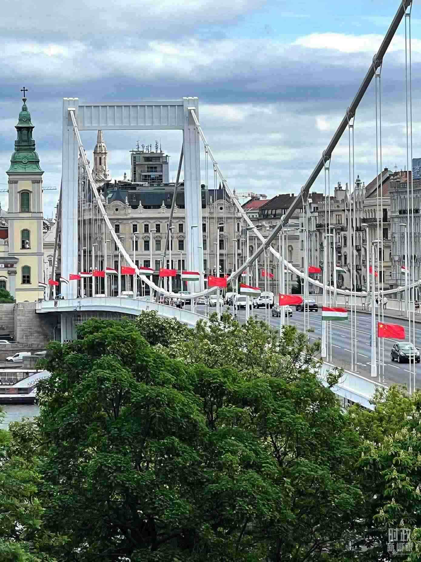 △懸掛中匈兩國國旗的布達(dá)佩斯伊麗莎白大橋。(總臺(tái)央視記者石偉明拍攝)