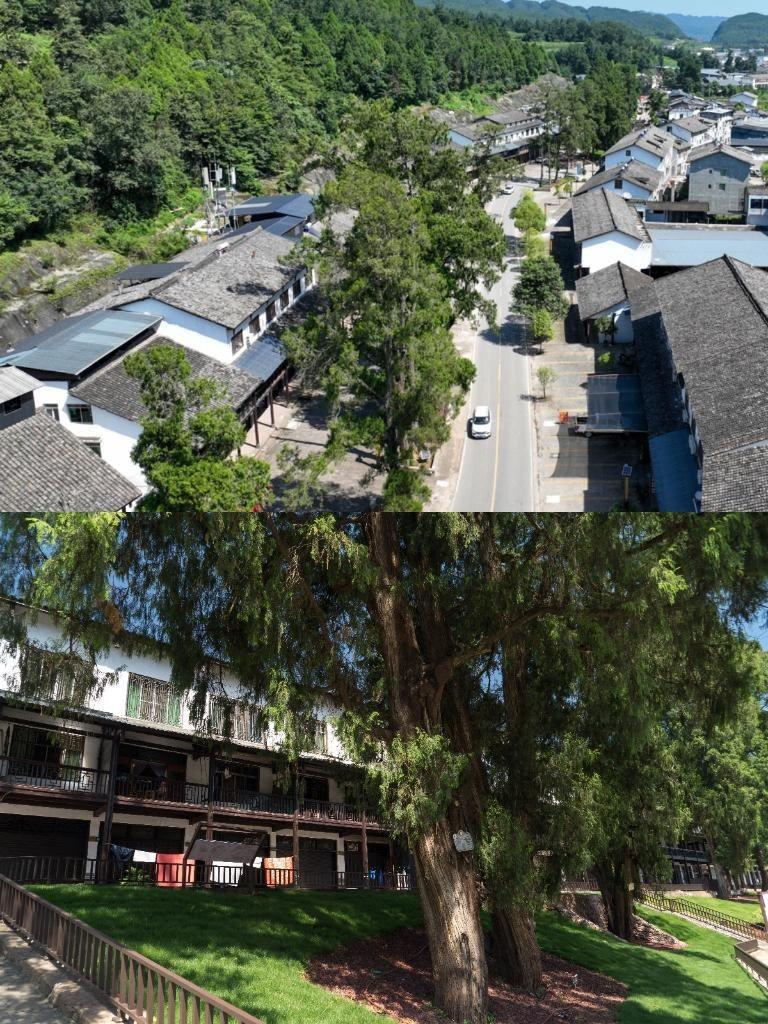 拼版照片:上圖,2024年8月12日拍攝的劍門(mén)關(guān)古柏保護(hù)示范小區(qū)(無(wú)人機(jī)照片),新華社記者 胥冰潔 攝;下圖,2024年8月12日在劍門(mén)關(guān)古柏保護(hù)示范小區(qū)拍攝的古柏,新華社記者 唐文豪 攝