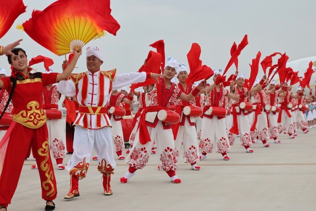 2023年5月17日下午,出席中國-中亞峰會(huì)的哈薩克斯坦總統(tǒng)托卡耶夫抵達(dá)陜西省西安市。當(dāng)?shù)孛癖娨詿崆榈难?、歡快的秧歌等民間藝術(shù)表演歡迎貴賓到來。新華社記者 邢廣利 攝