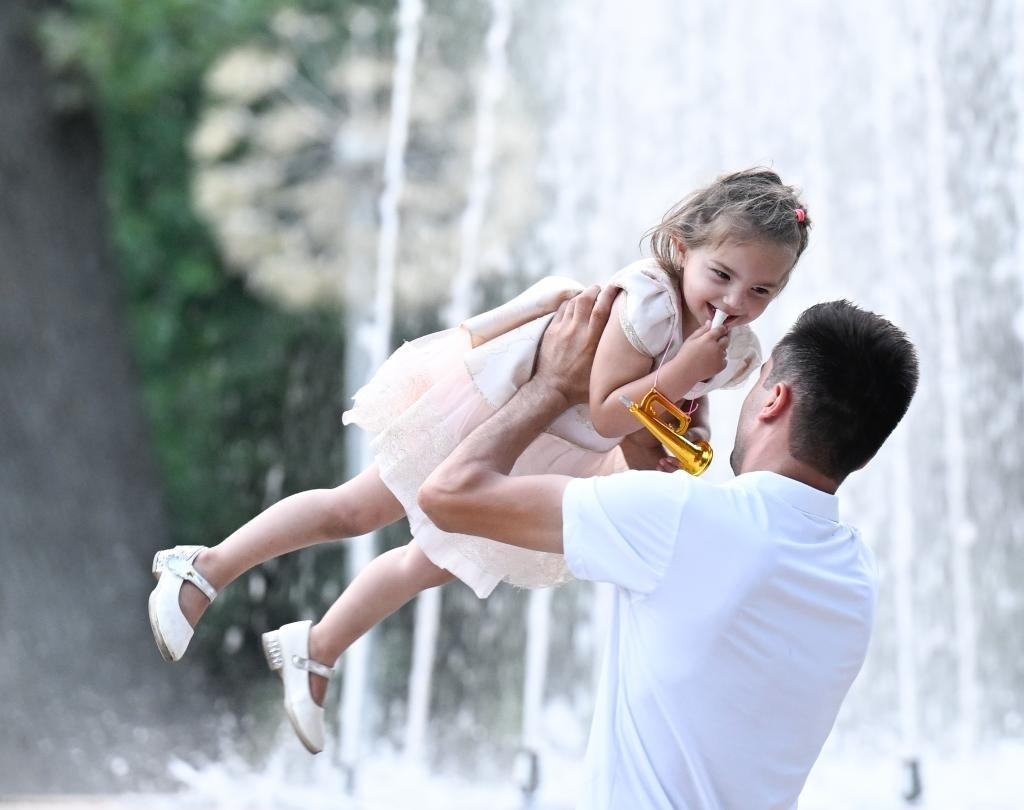 6月29日,在塔吉克斯坦首都杜尚別,一名男子在魯達基公園內(nèi)與孩子玩耍。