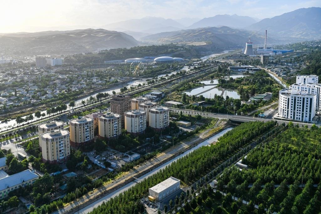 6月26日,從獨立與自由塔上眺望,奔騰的瓦爾佐布河穿城而過,杜尚別城市風(fēng)光盡入眼簾。
