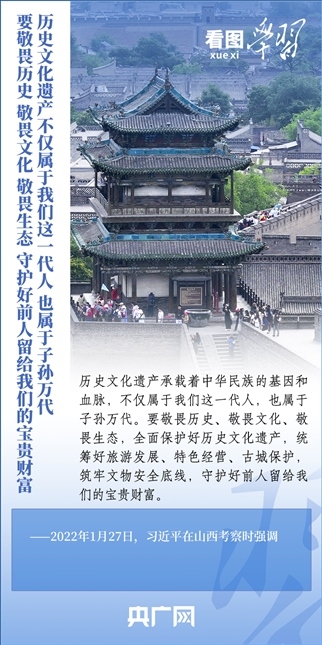 文化遺產(chǎn)是中華優(yōu)秀傳統(tǒng)文化的重要載體,承載著中華民族的基因和血脈。做好歷史文化遺產(chǎn)保護(hù)傳承工作,習(xí)近平總書(shū)記強(qiáng)調(diào),要統(tǒng)籌好旅游發(fā)展、特色經(jīng)營(yíng)、古城保護(hù),筑牢文物安全底線(xiàn),守護(hù)好前人留給我們的寶貴財(cái)富。