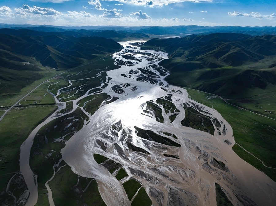 在青海省果洛藏族自治州達(dá)日縣境內(nèi)拍攝的黃河(2024年7月31日攝,無(wú)人機(jī)照片)。新華社記者 張龍 攝