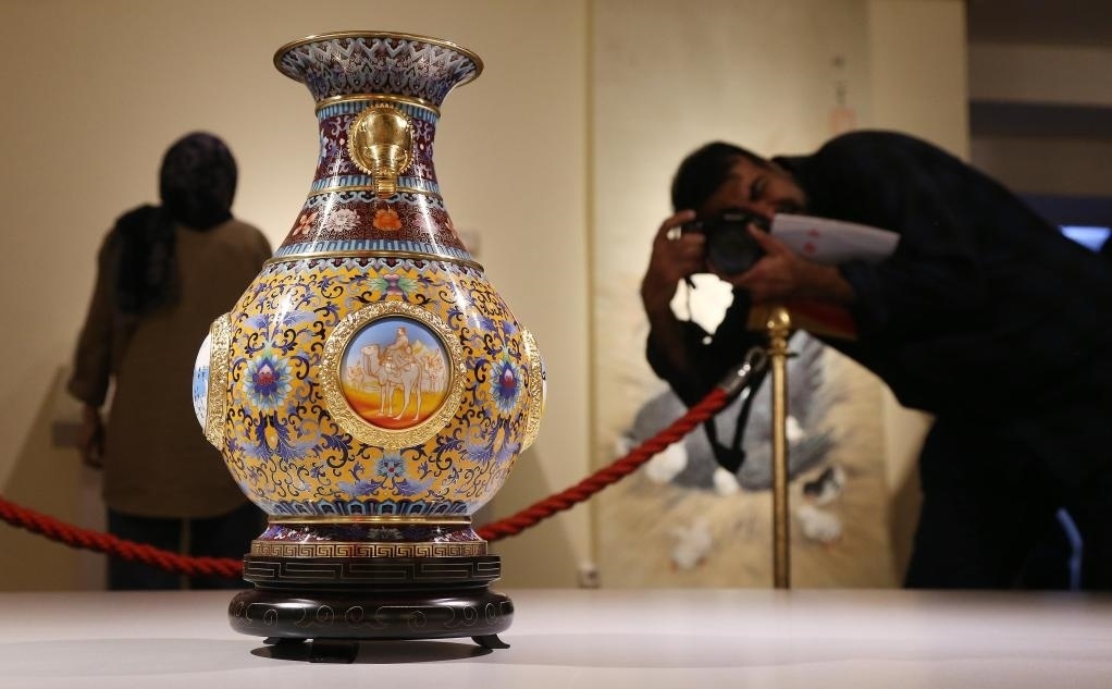 2024年10月12日,在伊朗首都德黑蘭的馬利克國家博物館,觀眾在“絲路長云——中國藝術文化精品展”現(xiàn)場拍攝展品。新華社記者 沙達提 攝