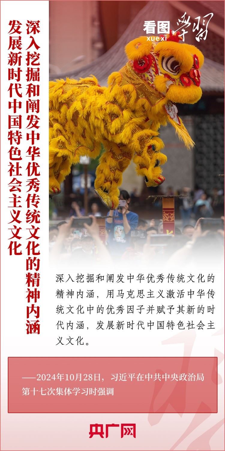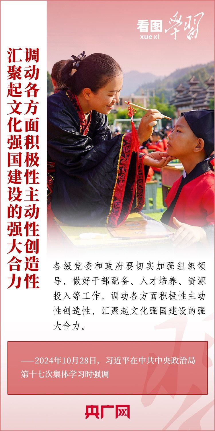 建設(shè)文化強(qiáng)國(guó)是全黨全社會(huì)的共同任務(wù)。10月28日,中共中央政治局就建設(shè)文化強(qiáng)國(guó)進(jìn)行第十七次集體學(xué)習(xí)。習(xí)近平總書記在聽取講解和討論后發(fā)表重要講話,就錨定2035年建成文化強(qiáng)國(guó)戰(zhàn)略目標(biāo)作出最新部署,強(qiáng)調(diào)要“不斷發(fā)展具有強(qiáng)大思想引領(lǐng)力、精神凝聚力、價(jià)值感召力、國(guó)際影響力的新時(shí)代中國(guó)特色社會(huì)主義文化,不斷增強(qiáng)人民精神力量,筑牢強(qiáng)國(guó)建設(shè)、民族復(fù)興的文化根基?!币黄饋韺W(xué)習(xí)!