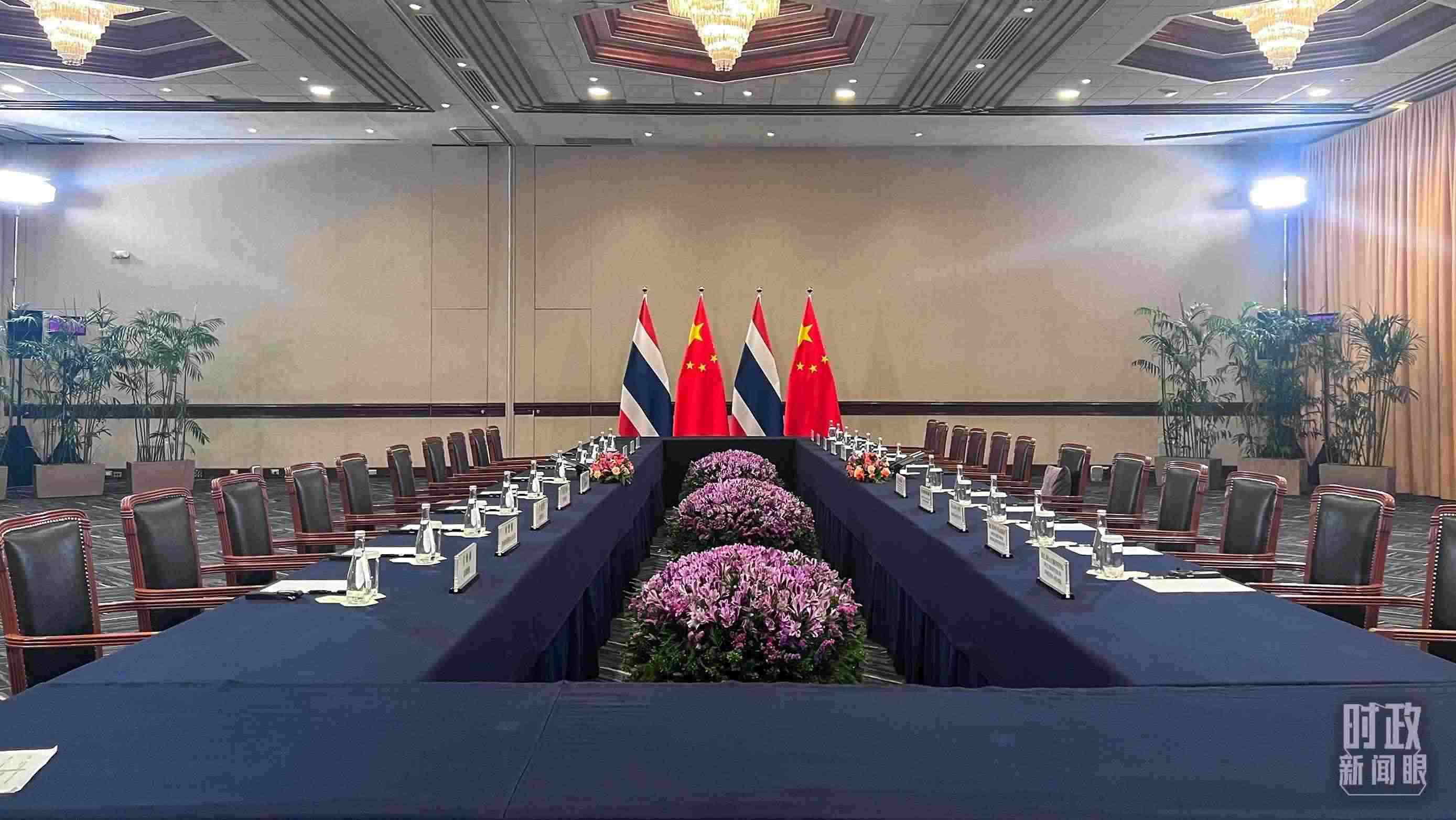 △會見現(xiàn)場的中泰兩國國旗。(總臺央視記者范一鳴拍攝)
