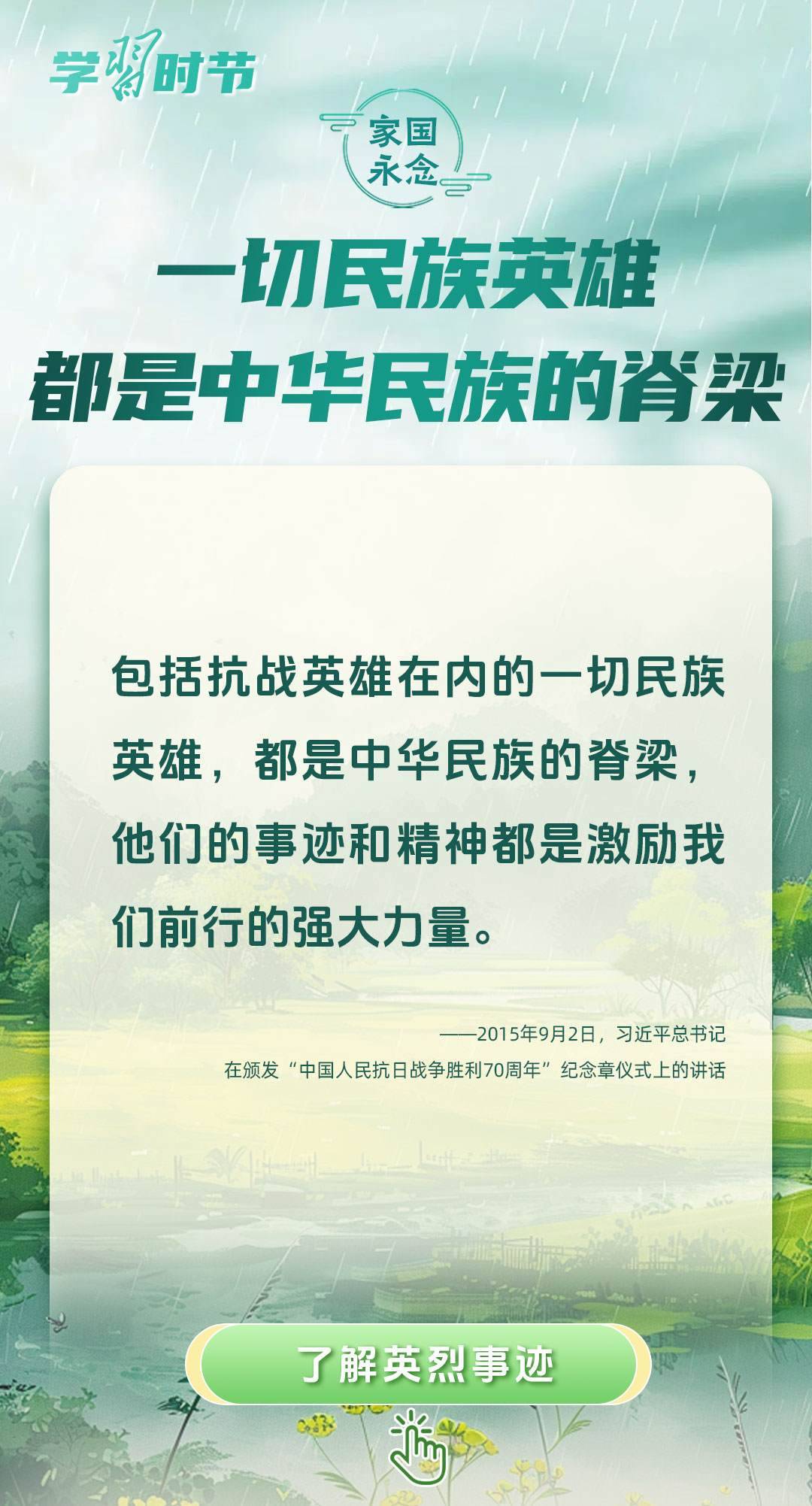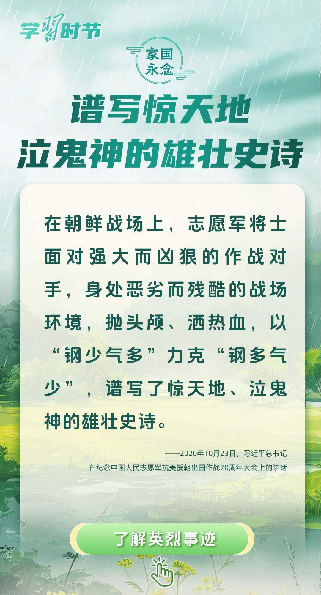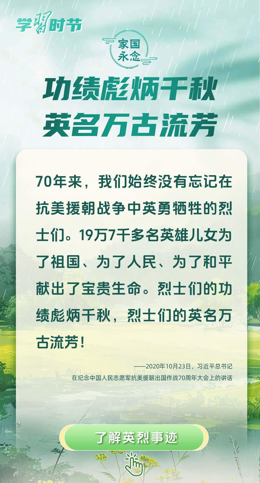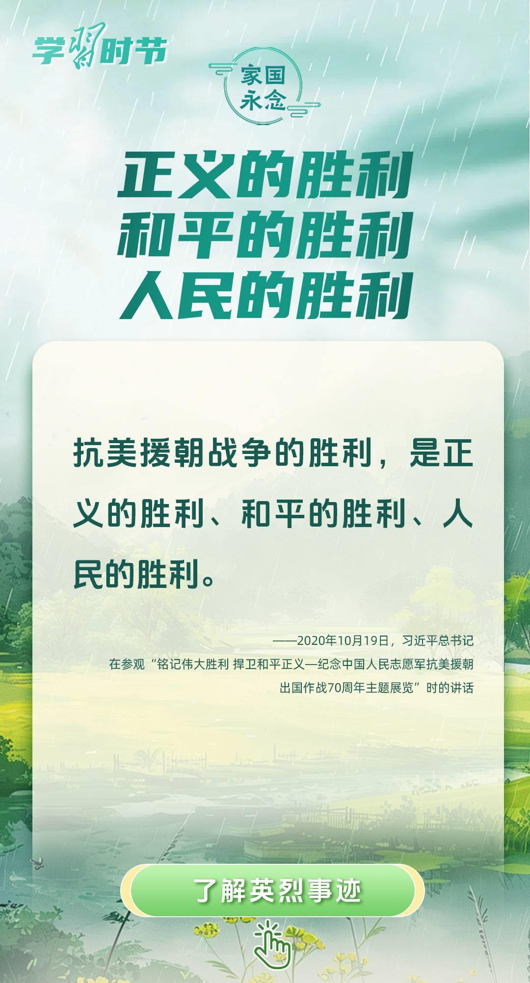 今年是中國(guó)人民抗日戰(zhàn)爭(zhēng)暨世界反法西斯戰(zhàn)爭(zhēng)勝利80周年、中國(guó)人民志愿軍抗美援朝出國(guó)作戰(zhàn)75周年。習(xí)近平總書(shū)記曾說(shuō):“對(duì)一切為國(guó)家、為民族、為和平付出寶貴生命的人們,不管時(shí)代怎樣變化,我們都要永遠(yuǎn)銘記他們的犧牲和奉獻(xiàn)?!苯裉煳覀兯鶕碛械囊磺?,無(wú)不凝結(jié)著英雄、英烈們的奉獻(xiàn)付出乃至巨大犧牲。