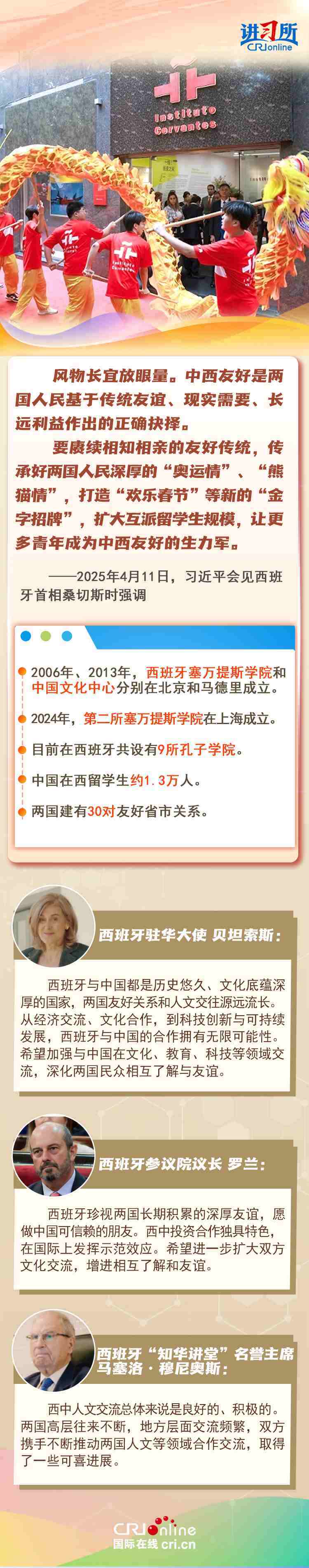今年是中西全面戰(zhàn)略伙伴關(guān)系建立20周年,也是中歐建交50周年。多年來(lái),中西兩國(guó)領(lǐng)導(dǎo)人保持密切互動(dòng),秉持互尊互信、互利共贏精神,兩國(guó)在深化貿(mào)易、投資、科技創(chuàng)新、綠色能源等領(lǐng)域取得豐富合作成果,雙邊關(guān)系走在中國(guó)同歐洲國(guó)家關(guān)系前列。在西班牙人士眼中,良好的對(duì)華關(guān)系對(duì)西班牙、歐洲和世界具有重要意義,將會(huì)為兩國(guó)人民帶來(lái)更多實(shí)實(shí)在在的福祉,也將共同創(chuàng)造更美好的未來(lái)。