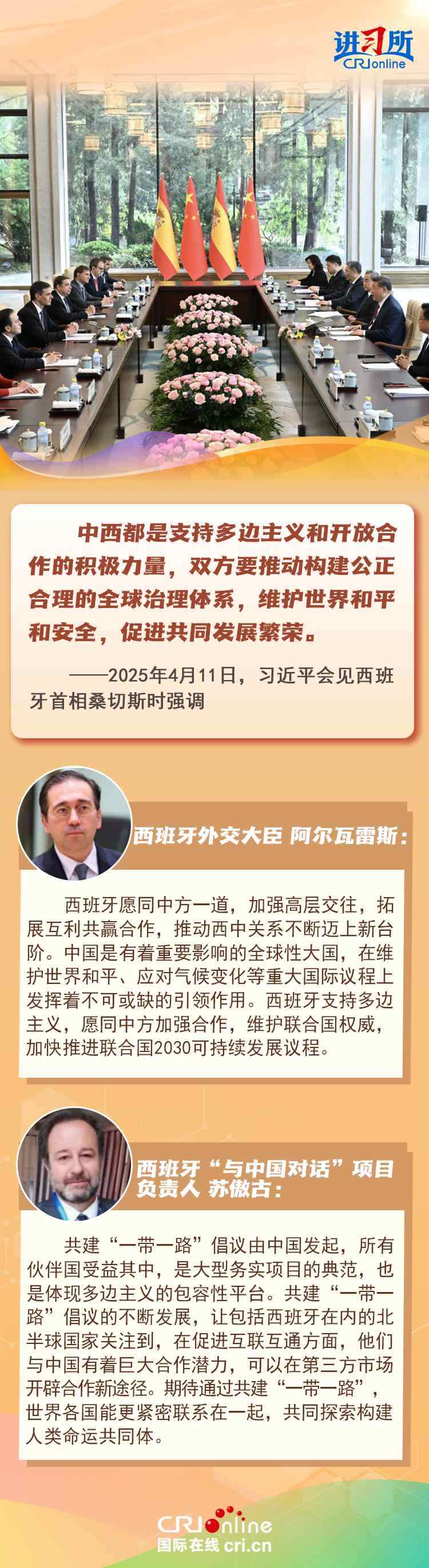 4月11日,中國(guó)國(guó)家主席習(xí)近平在北京會(huì)見(jiàn)來(lái)華訪問(wèn)的西班牙首相桑切斯時(shí)表示,中西友好是兩國(guó)人民基于傳統(tǒng)友誼、現(xiàn)實(shí)需要、長(zhǎng)遠(yuǎn)利益作出的正確抉擇,中西都是支持多邊主義和開(kāi)放合作的積極力量,雙方要推動(dòng)構(gòu)建公正合理的全球治理體系,維護(hù)世界和平和安全,促進(jìn)共同發(fā)展繁榮。