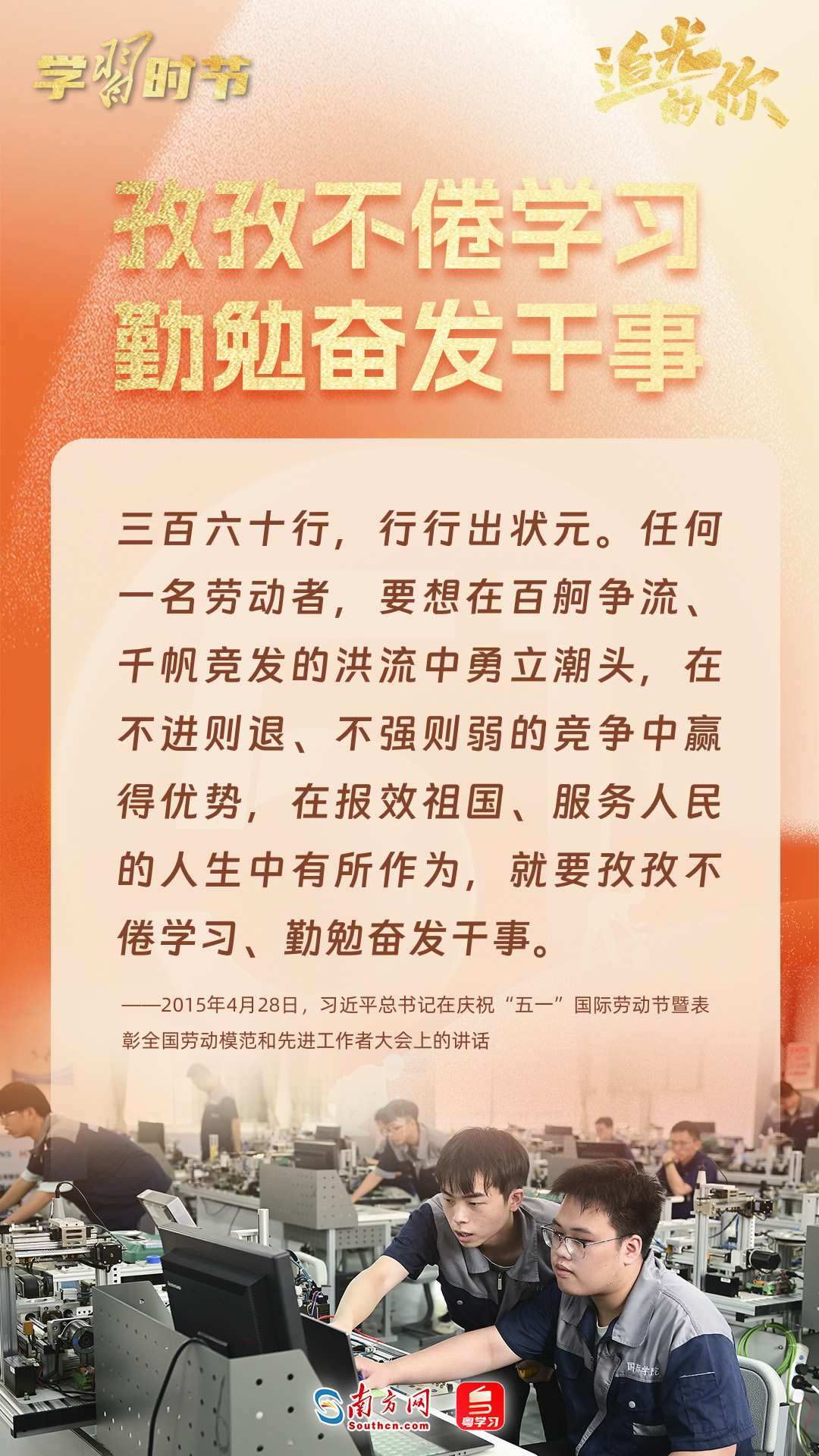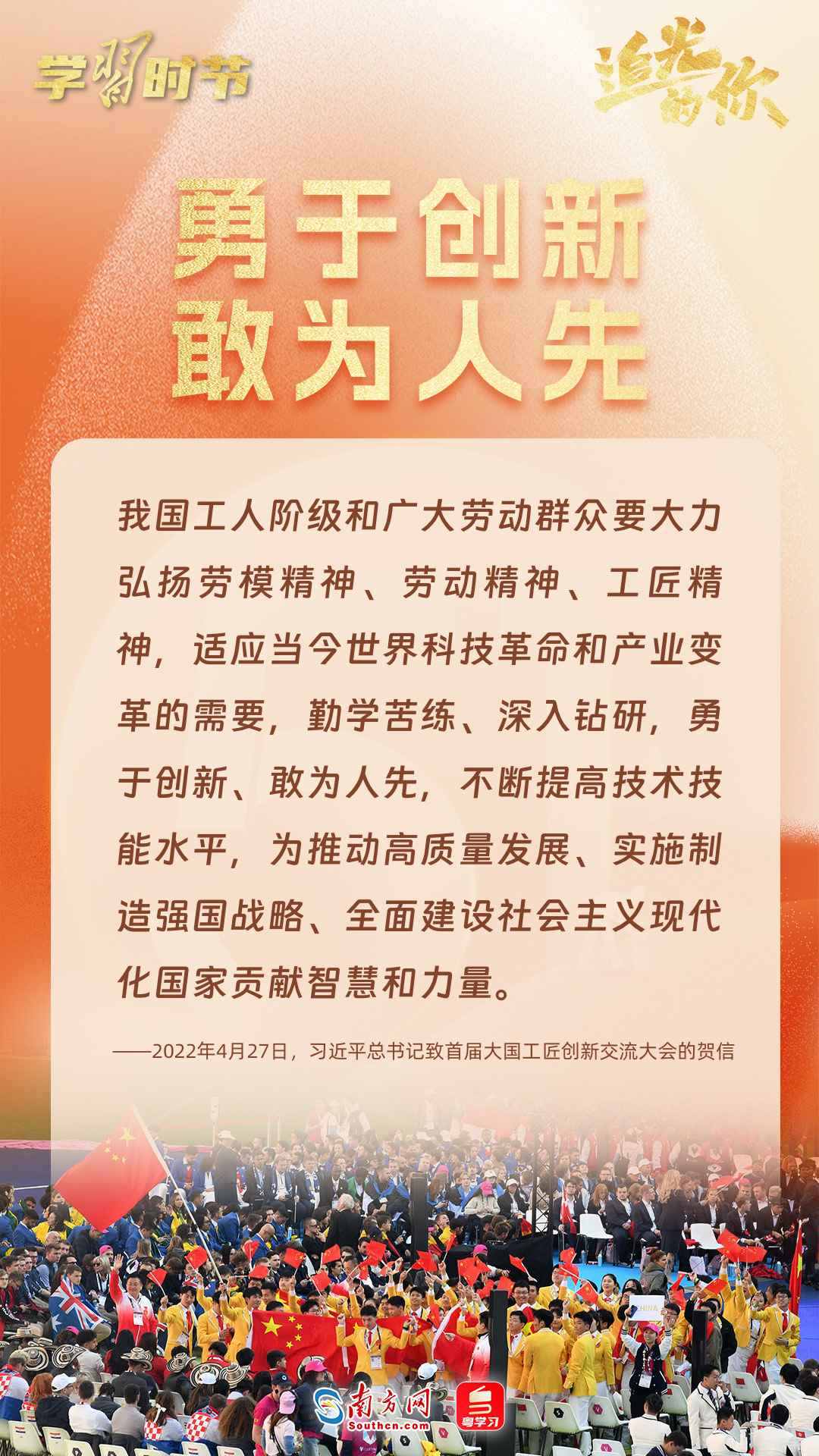 勞動譜寫時代華章,奮斗創(chuàng)造美好未來。黨的十八大以來,在以習(xí)近平同志為核心的黨中央帶領(lǐng)下,各行各業(yè)勞動者砥礪奮進(jìn),實(shí)干篤行,在全面建設(shè)社會主義現(xiàn)代化國家新征程上書寫奮斗新篇章。習(xí)近平總書記曾多次深情禮贊勞動者,勉勵廣大勞動者拼搏奮斗、爭創(chuàng)一流。
