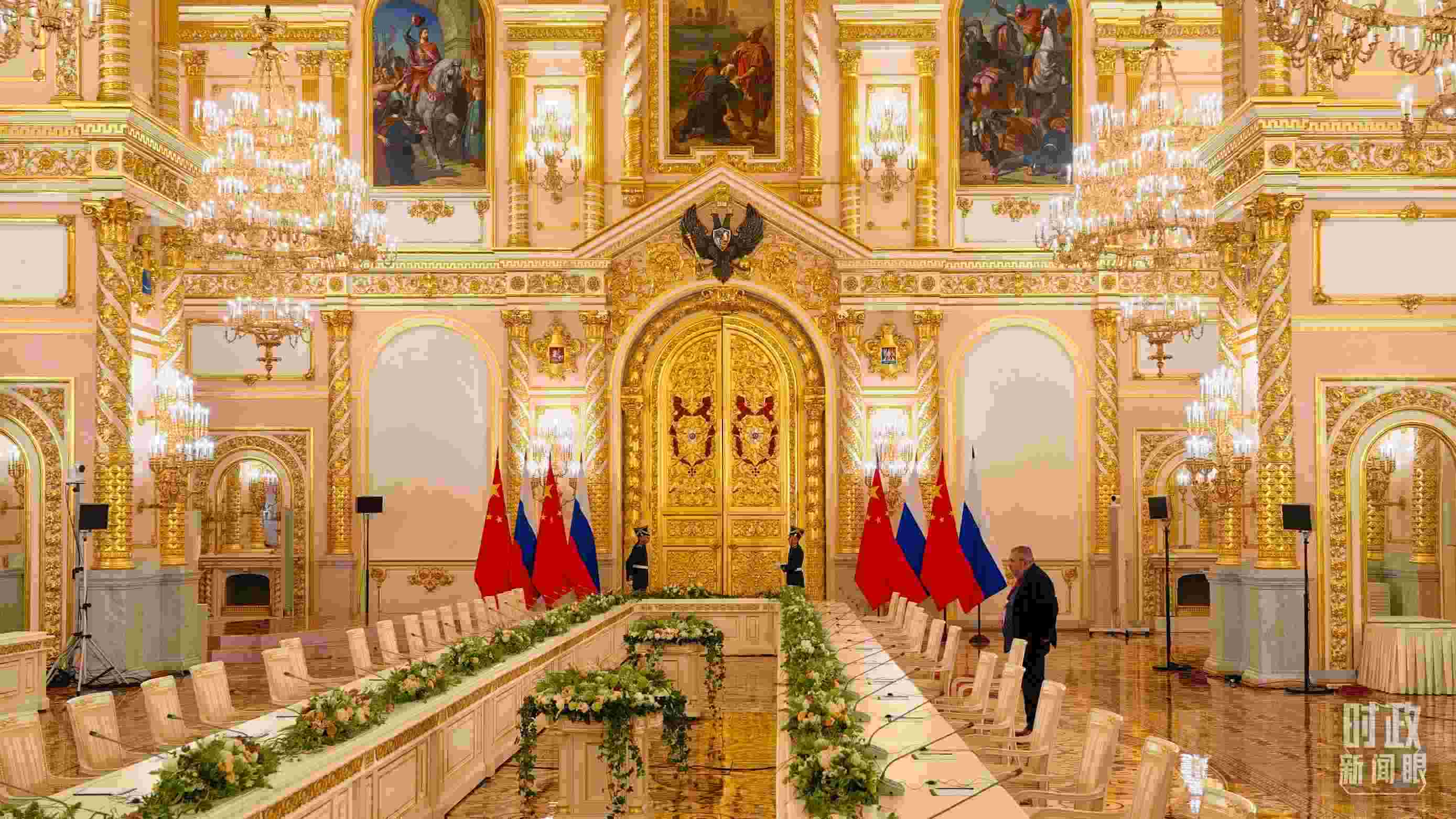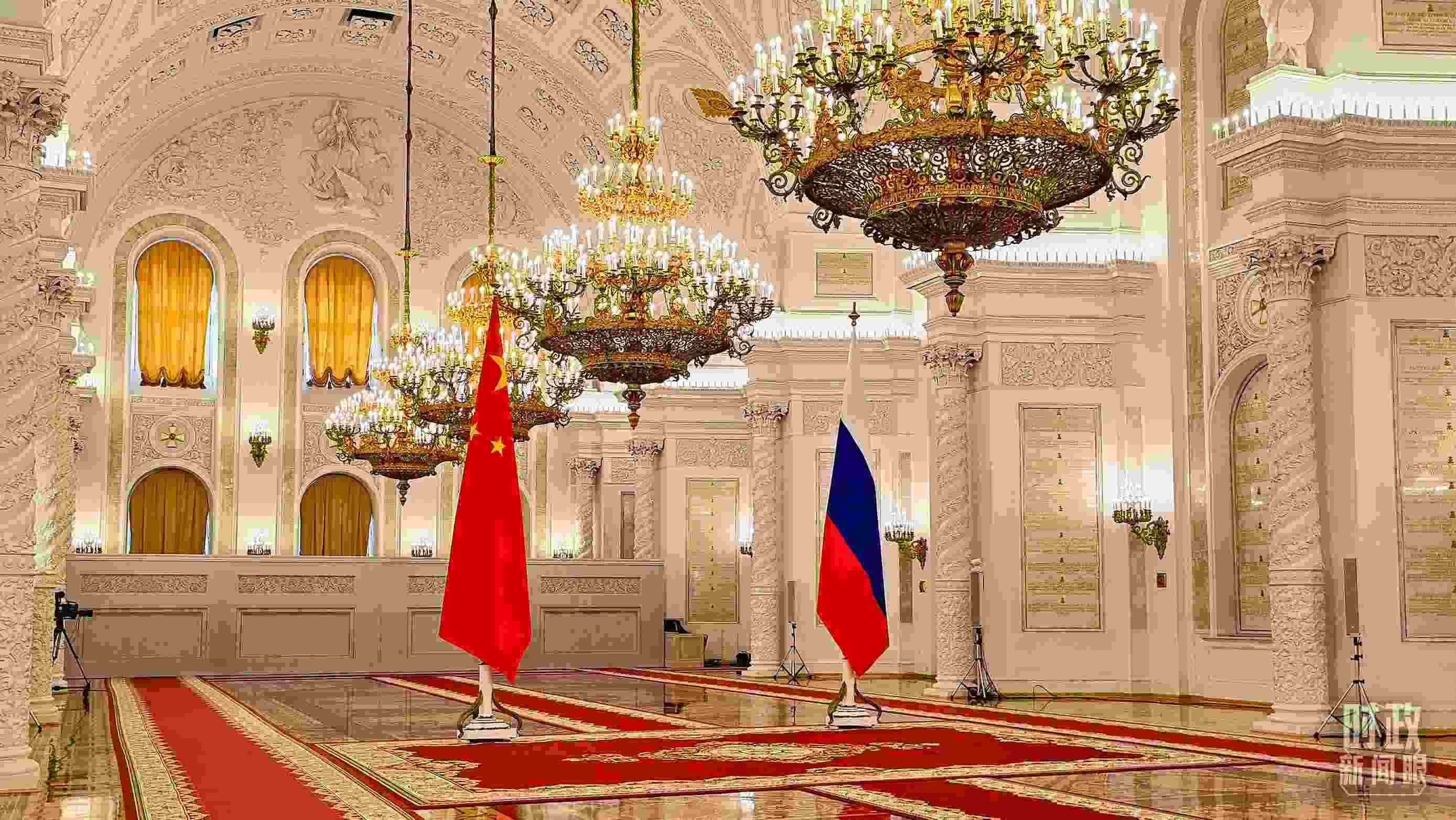 8日上午,在克里姆林宮二層的喬治大廳,普京總統(tǒng)為習主席舉行隆重歡迎儀式。兩國元首從兩側沿紅地毯健步走入大廳中央,親切握手合影。2019年、2023年習主席對俄羅斯進行國事訪問時,普京總統(tǒng)也是在這里為習主席舉行隆重歡迎儀式。
