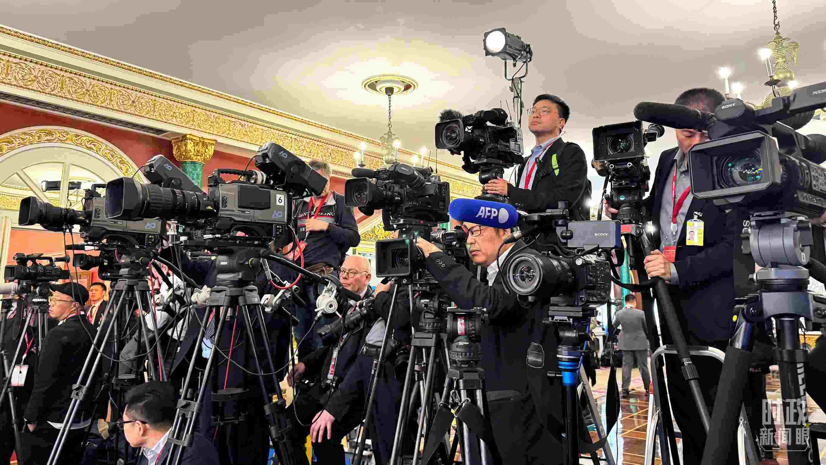 △等待中俄兩國元首共見記者的中外媒體同仁。(總臺央視記者陸泓宇、蔣碩拍攝)