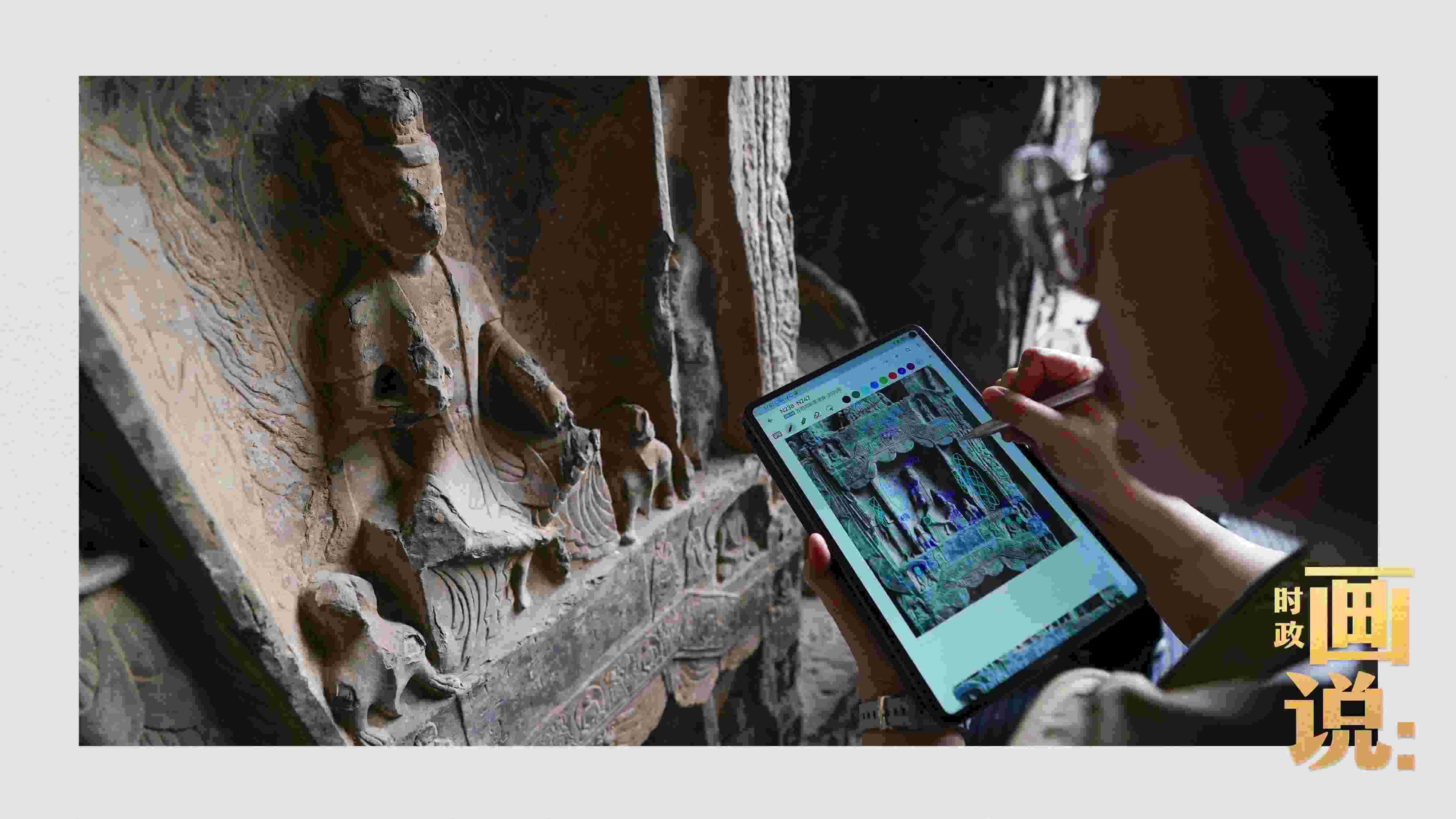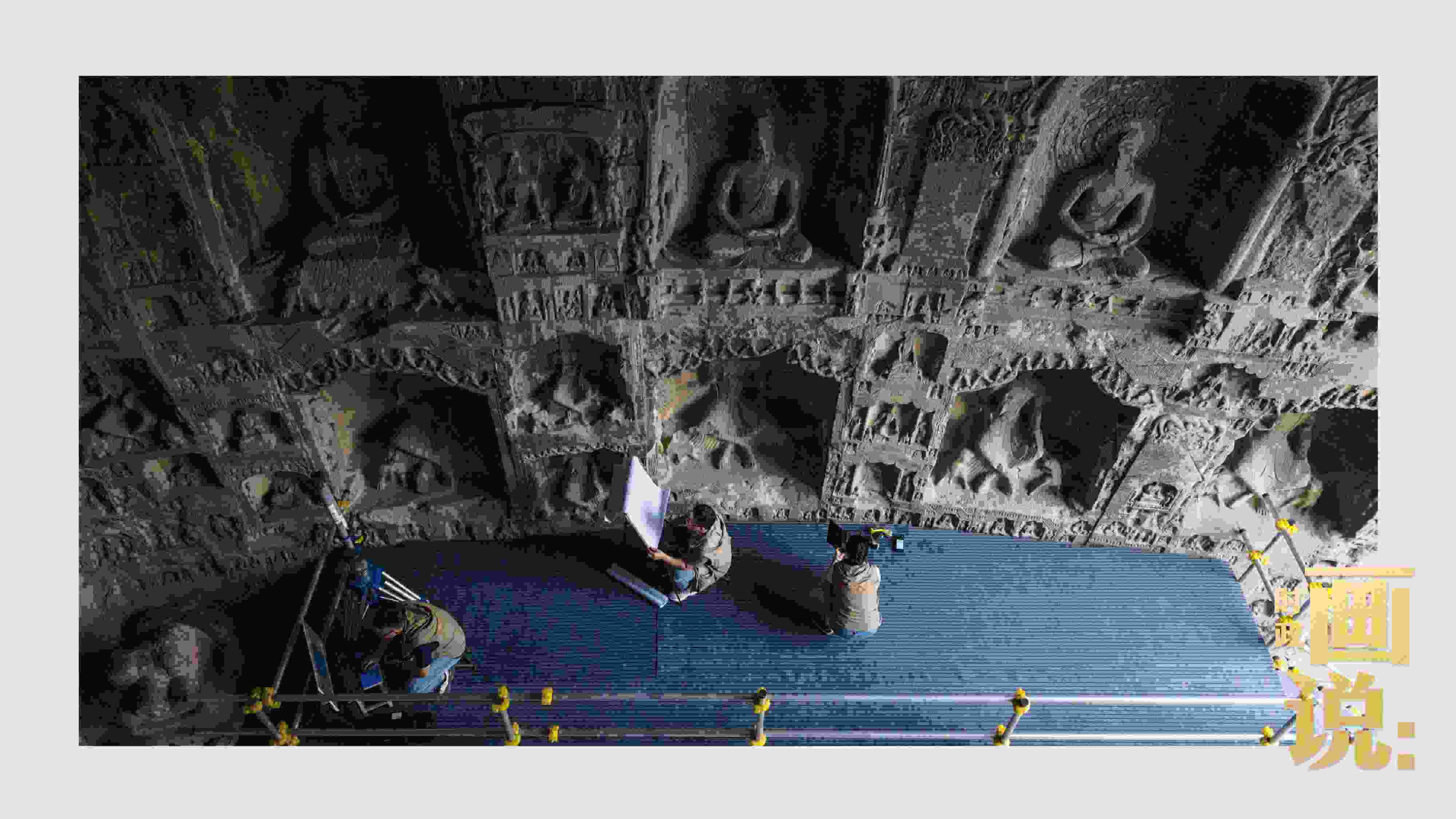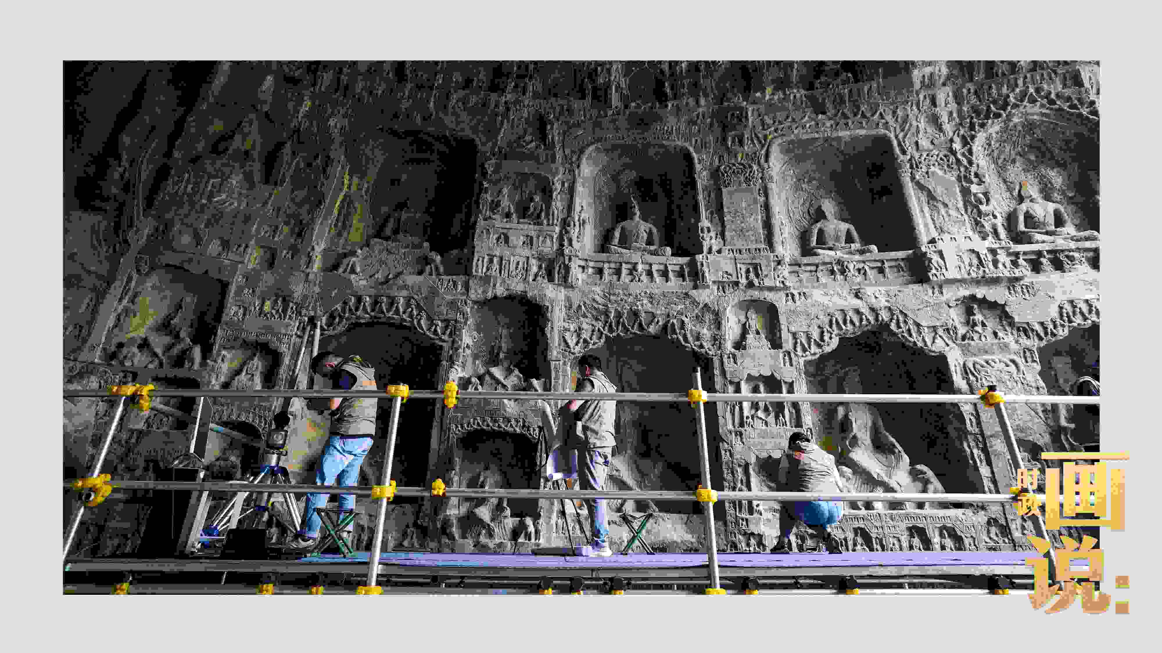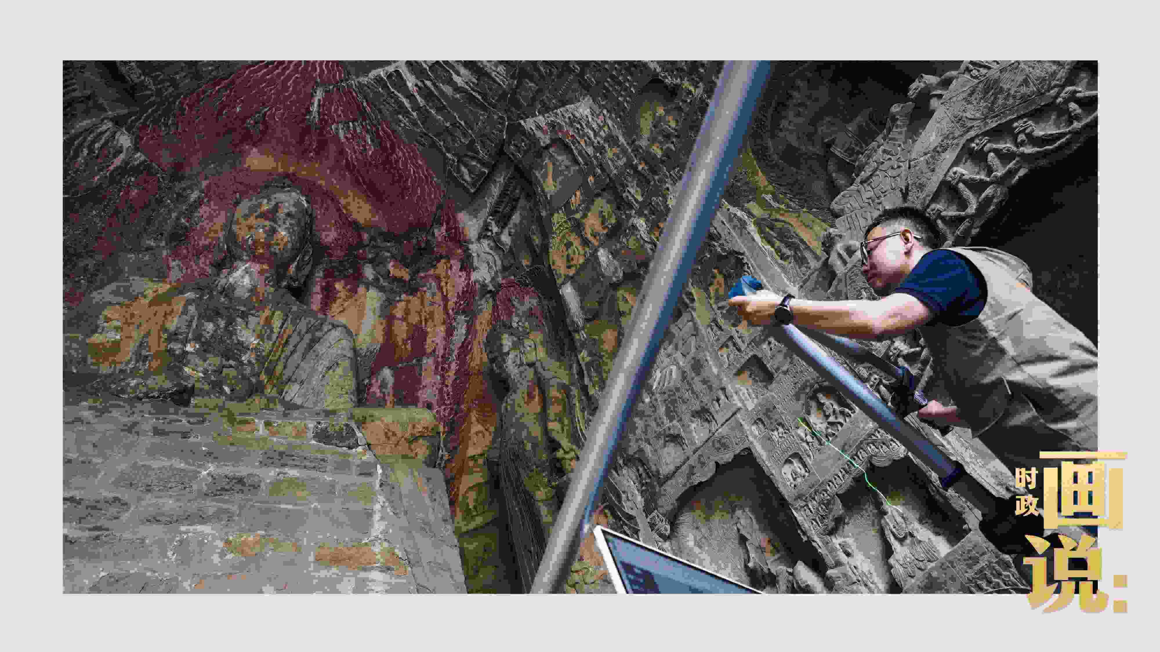 △龍門石窟研究院工作人員在古陽洞使用關(guān)節(jié)臂掃描儀對佛像進行數(shù)字化掃描