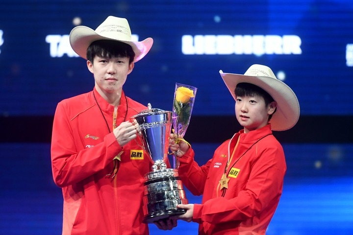 11月28日,孫穎莎(右)/王楚欽在混雙頒獎儀式上手舉冠軍獎杯合影。新華社記者 吳曉凌/攝
