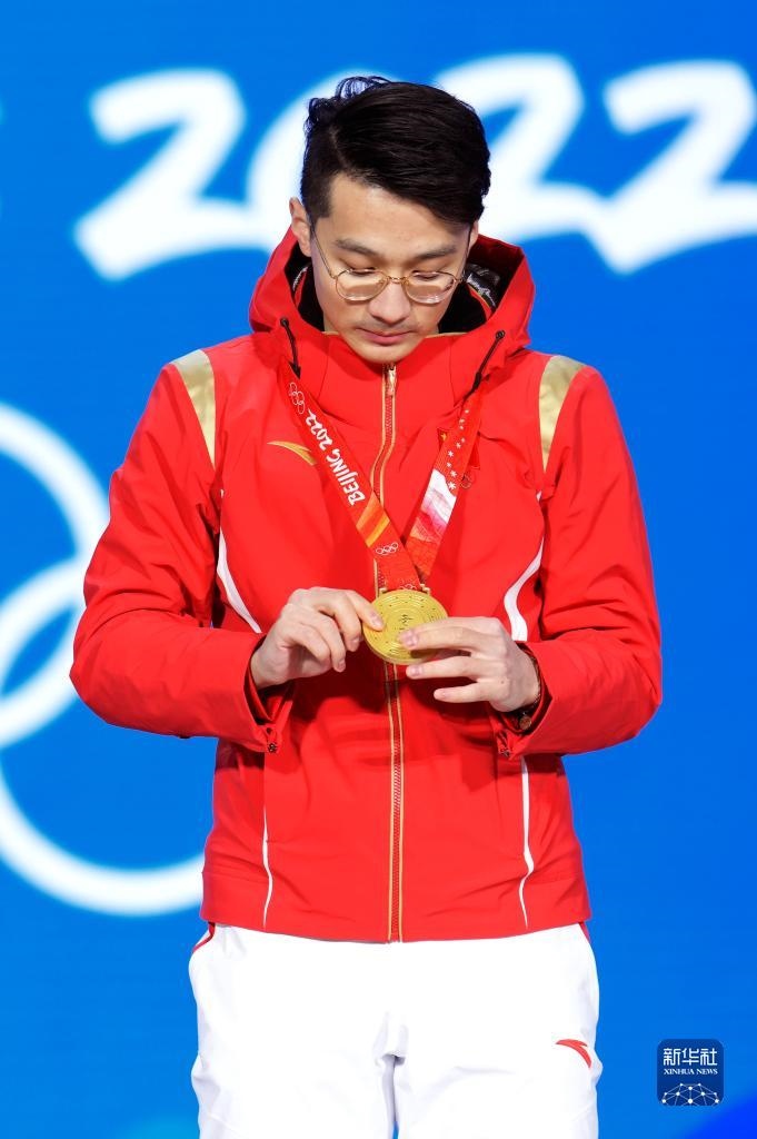2月8日,冠軍中國(guó)隊(duì)選手任子威在獎(jiǎng)牌頒發(fā)儀式上。