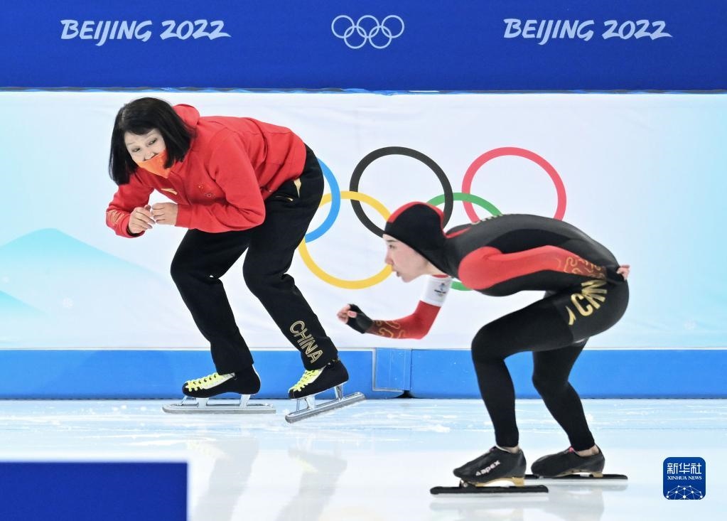 2月10日,教練在場邊指導(dǎo)中國選手韓梅(右)。