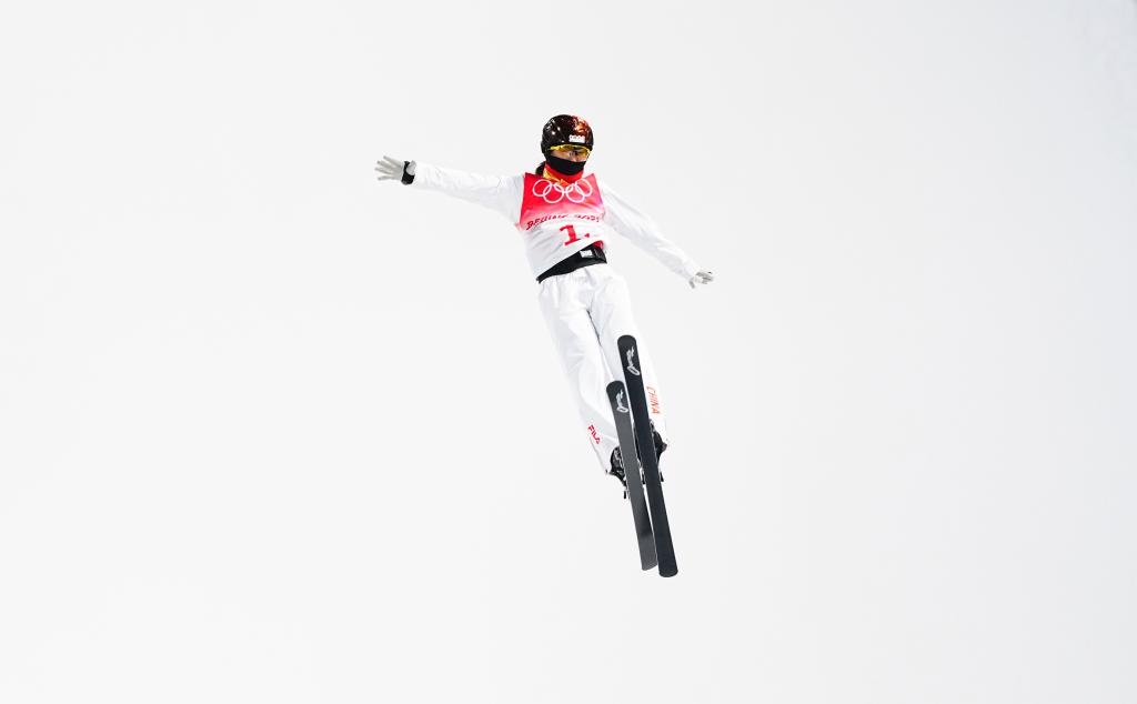 2月10日,中國隊選手徐夢桃在北京冬奧會自由式滑雪空中技巧混合團體決賽中。新華社記者許暢攝