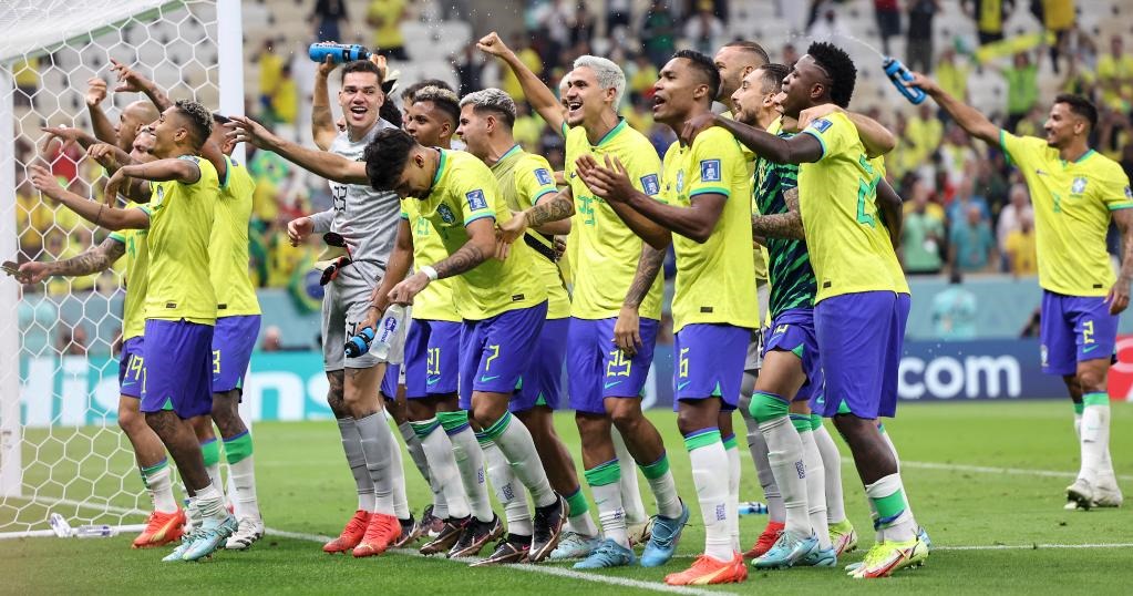 當(dāng)理查利森將皮球送入網(wǎng)窩,所有巴西隊(duì)球員飛奔到角球區(qū),他們團(tuán)抱在一起,瘋狂地蹦蹦跳跳。然后,理查利森走在最前面,在震耳欲聾的鼓點(diǎn)聲、歡呼聲中,巴西球員們扭動(dòng)身體,開始舞蹈。24日的盧賽爾體育場(chǎng),變成了巴西人的大舞臺(tái)。