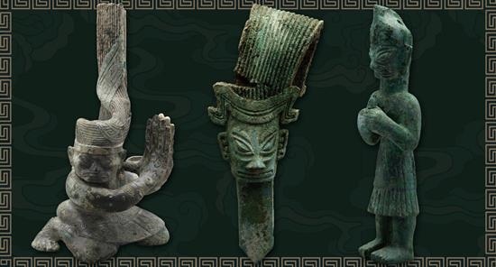 三星堆出土的銅扭頭跪坐人像、銅立發(fā)人像、銅小立人像(從左至右)。 受訪者供圖