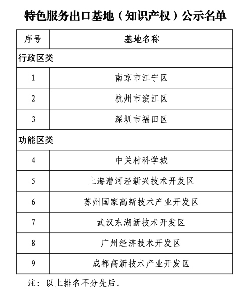 據(jù)國家知識產(chǎn)權(quán)局官網(wǎng)消息,根據(jù)《商務(wù)部等7部門辦公廳(室)關(guān)于組織申報專業(yè)類特色服務(wù)出口基地的通知》(商辦服貿(mào)函〔2021〕355號)要求,經(jīng)地方申報、省市知識產(chǎn)權(quán)和商務(wù)主管部門初審?fù)扑]、第三方機構(gòu)客觀指標(biāo)評審、專家評審、部門工作組復(fù)核等程序,初步認定知識產(chǎn)權(quán)服務(wù)出口基地9家,名單于2月7日-2月11日進行公示。