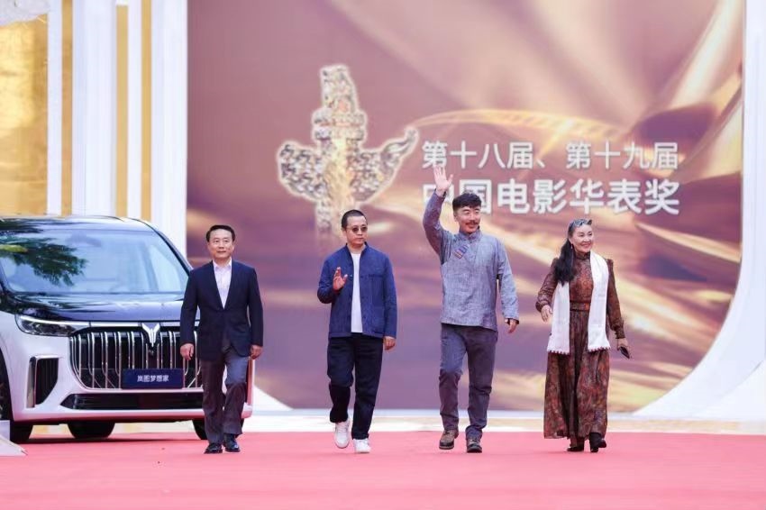 呼和巴特爾(左一)和《片警寶音》劇組成員登上了華表獎(jiǎng)?lì)I(lǐng)獎(jiǎng)臺