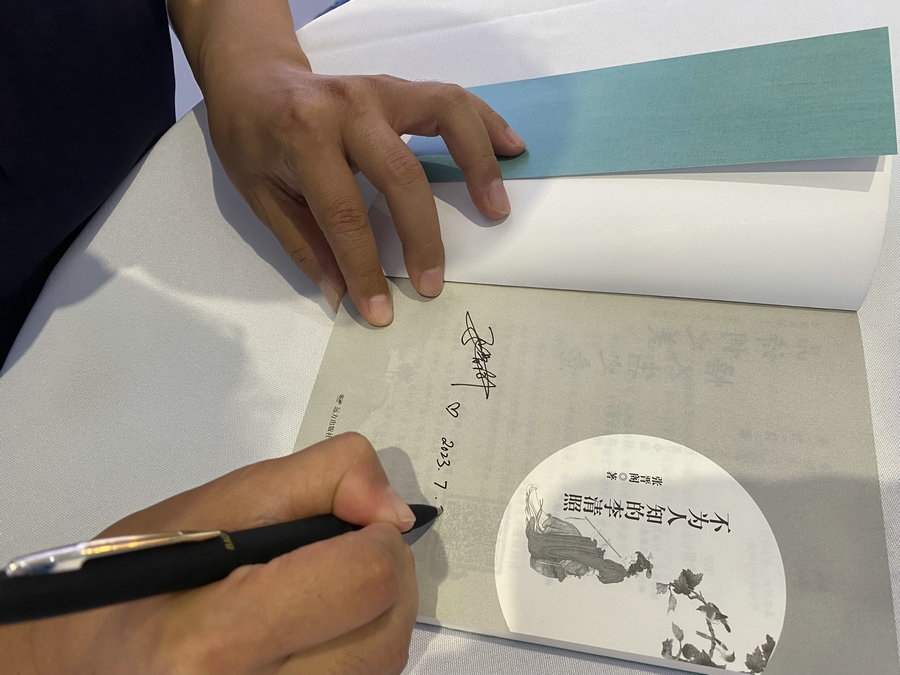 圍繞某些宋人作品中記載的李清照“流落以死”、李清照卒年的多版本說法、李清照的詩詞風格為什么會從婉約轉變到豪放等“疑點”,張晉閣先生為大家講述了《不為人知的李清照》的寫作緣由、研究經歷、文字表達形式和內心希冀。隨后,兩位讀者分別提出“您最喜歡李清照的哪一首詩詞”、“對李清照的寫作產生深遠影響的人是誰”這兩個問題,張晉閣先生分享了自己的看法并朗誦了優(yōu)美的詩詞佳作,現場交流、互動氣氛熱烈。活動結束后,張晉閣先生為讀者朋友們簽名留念。多位年輕讀者表示,通過閱讀《不為人知的李清照》,加深了他們對古典詩詞的喜愛。