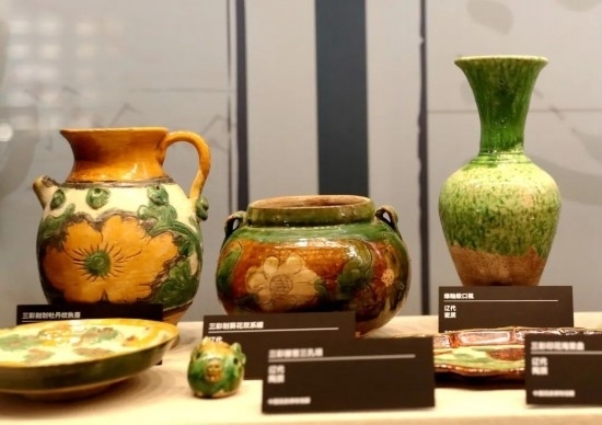 “遼三彩”直接承襲和模仿“唐三彩”,成為中華陶瓷文化傳承發(fā)展史上的重要一環(huán)。后排文物從左到右依次是:三彩刻劃牡丹紋執(zhí)壺、三彩劃葵花雙系罐、綠釉敞口瓶。(民族畫(huà)報(bào)記者 鷹鴿 攝)