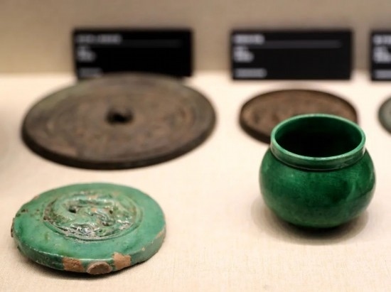 前排左:綠釉龍紋瓦當(dāng) 金代 首都博物館藏;前排右:定窯綠釉矮領(lǐng)罐 金代 中國(guó)民族博物館藏。(民族畫(huà)報(bào)記者 鷹鴿 攝)