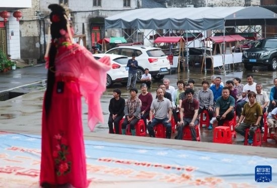 6月25日,在澧浦鎮(zhèn)鄭店村光南文化禮堂大舞臺(tái),婺之靈坐唱班的婺劇演員吳春桃表演婺劇《王昭君》。