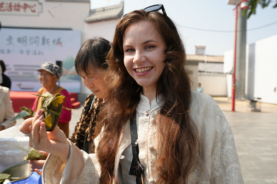 活動(dòng)現(xiàn)場,粽香四溢,歡聲笑語此起彼伏。大家圍在一起,捋粽葉、填糯米、扎絲線,共同體驗(yàn)包粽子的傳統(tǒng)習(xí)俗。手法嫻熟的村民手把手教授外國友人包粽子的技巧,不一會(huì)兒,一個(gè)個(gè)形態(tài)各異的粽子便擺滿了桌。來自烏克蘭的留學(xué)生安吉麗娜學(xué)得格外認(rèn)真,她一邊模仿著村民的動(dòng)作,一邊忍不住贊嘆:“喜歡包粽子,粽子好吃!”言語間滿是對(duì)中國傳統(tǒng)美食的喜愛。