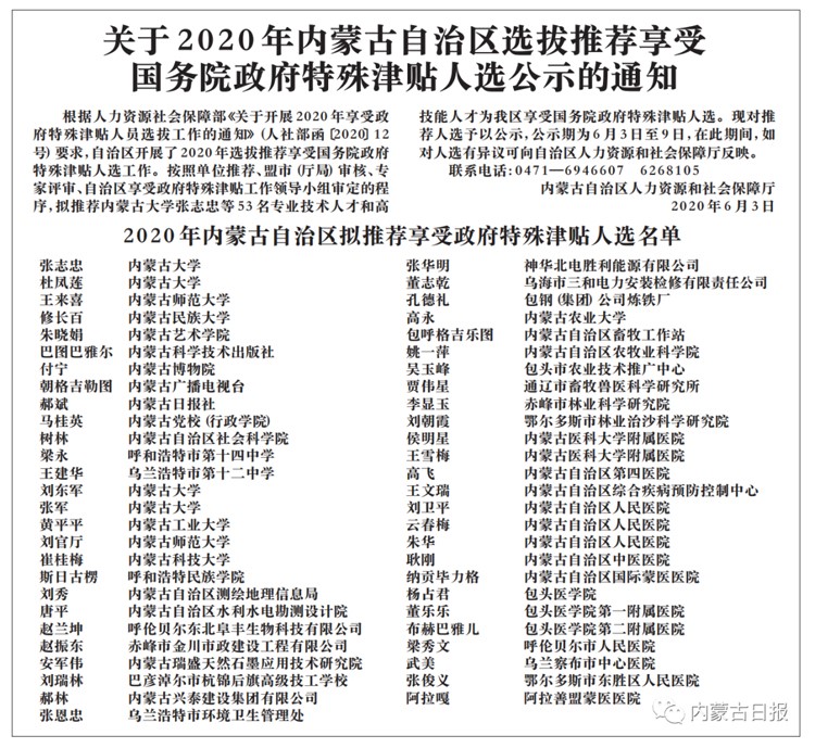 根據(jù)人力資源社會保障部《關(guān)于開展2020年享受政府特殊津貼人員選拔工作的通知》(人社部函〔2020〕12號)要求,自治區(qū)開展了2020年選拔推薦享受國務(wù)院政府特殊津貼人選工作。按照單位推薦、盟市(廳局)審核、專家評審、自治區(qū)享受政府特殊津貼工作領(lǐng)導(dǎo)小組審定的程序,擬推薦內(nèi)蒙古大學(xué)張志忠等53名專業(yè)技術(shù)人才和高技能人才為我區(qū)享受國務(wù)院政府特殊津貼人選。現(xiàn)對推薦人選予以公示,公示期為6月3日至9日,在此期間,如對人選有異議可向自治區(qū)人力資源和社會保障廳反映。
