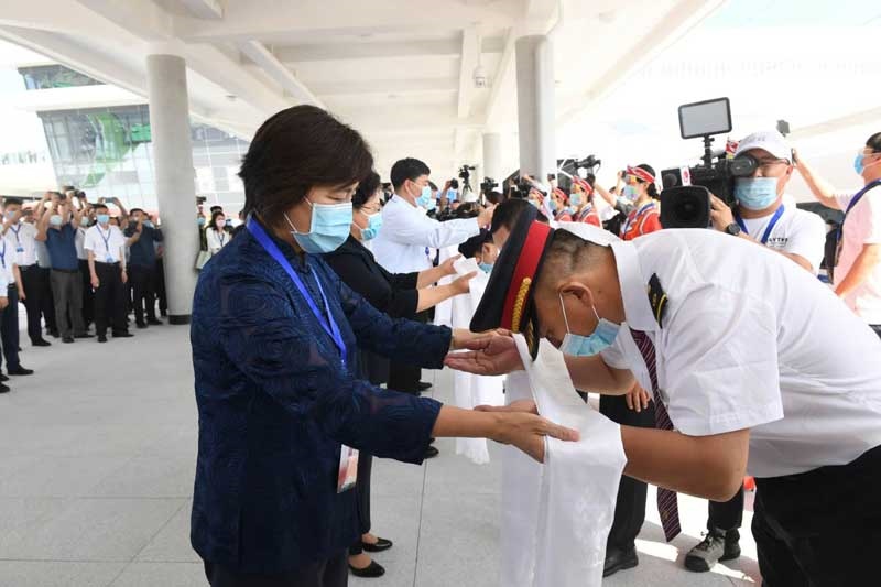 自治區(qū)黨委副書記、自治區(qū)主席布小林宣布赤喀高鐵正式開通運(yùn)營,并與自治區(qū)副主席艾麗華、自治區(qū)政府秘書長包振玉以及中國鐵路沈陽局集團(tuán)有限公司、蒙遼鐵路客運(yùn)專線有限責(zé)任公司、赤峰市委負(fù)責(zé)同志一起為列車組人員敬獻(xiàn)哈達(dá)。