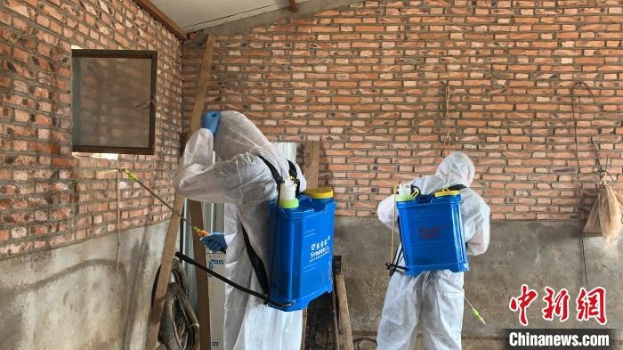 圖為呼斯楞正在跟同事一起為賽因烏力吉家棚圈消毒?!W藍 攝