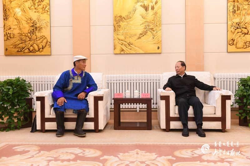 7月29日,自治區(qū)黨委書(shū)記、人大常委會(huì)主任石泰峰在主持召開(kāi)草原生態(tài)保護(hù)補(bǔ)助獎(jiǎng)勵(lì)政策實(shí)施情況專(zhuān)題匯報(bào)會(huì)前,會(huì)見(jiàn)自治區(qū)人大代表浩畢斯嘎拉圖。內(nèi)蒙古日?qǐng)?bào)記者袁永紅攝