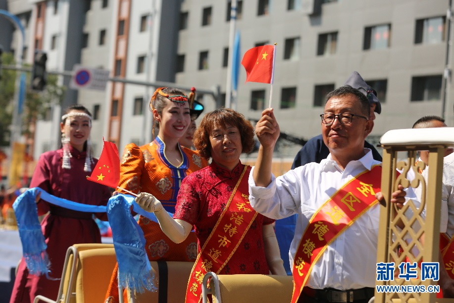 開幕式巡游車上手捧哈達(dá)的群眾代表。新華網(wǎng) 楊騰格爾攝