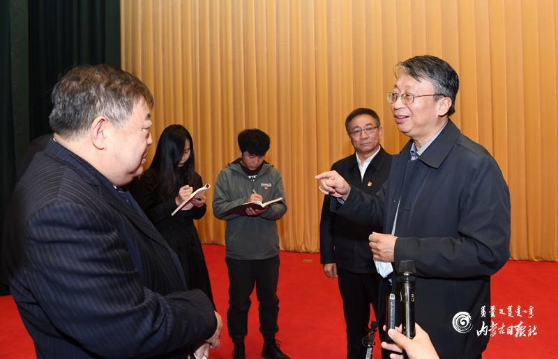 11月8日上午,在學(xué)習(xí)貫徹黨的十九屆五中全會(huì)精神中央宣講團(tuán)內(nèi)蒙古報(bào)告會(huì)結(jié)束后,聆聽報(bào)告會(huì)的部分人員與宣講人沈春耀互動(dòng)交流。內(nèi)蒙古日報(bào)記者 袁永紅 攝