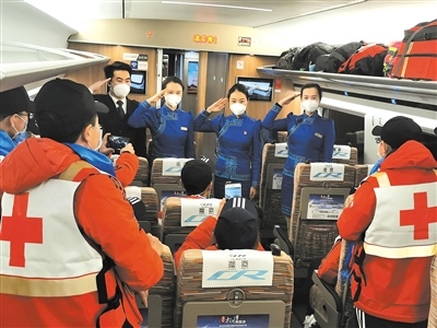 作為連通全國的運輸動脈,在完成常規(guī)運輸任務的基礎上,高鐵列車還承擔起了運送醫(yī)務人員、醫(yī)療用品和保障物資的特別任務。內(nèi)蒙古援鄂醫(yī)療隊員兩批次乘坐G2438次列車從北京中轉(zhuǎn)赴武漢;五批次乘坐“草原動車”由鄂爾多斯回到呼和浩特?!八陀⑿鄢稣?,接英雄回家”,七次運輸任務,高鐵車隊以最高禮遇和精心的服務,贏得醫(yī)療隊員們的紛紛好評?!爸x謝你們,出發(fā)時為我們送行,歸來時為我們唱起凱旋之歌。”醫(yī)療隊隊員李紅娟緊緊握住列車長張雨的手說。