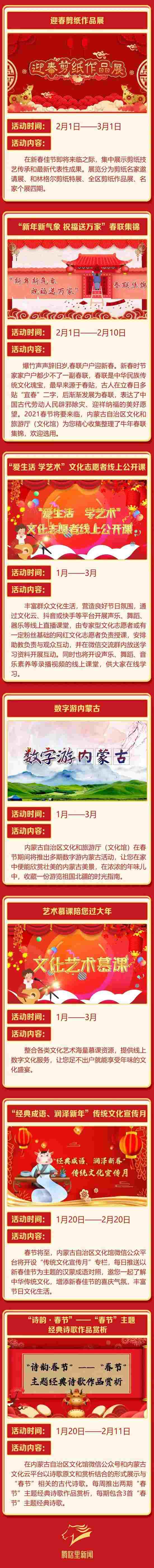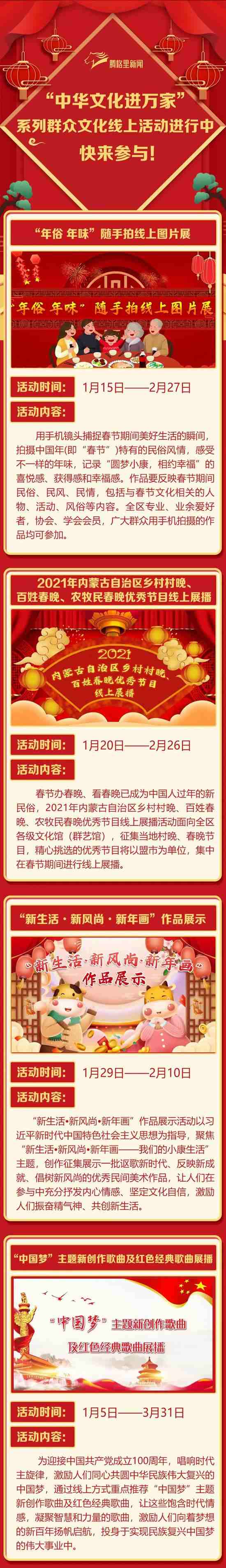 2021年春節(jié)的腳步越來(lái)越近,為豐富春節(jié)期間廣大群眾的精神文化生活,營(yíng)造歡樂(lè)、團(tuán)圓、喜慶、祥和的節(jié)日氛圍,內(nèi)蒙古自治區(qū)文化和旅游廳(文化館)于2021年1月至3月將推出“中華文化進(jìn)萬(wàn)家”系列群眾文化線上活動(dòng)。